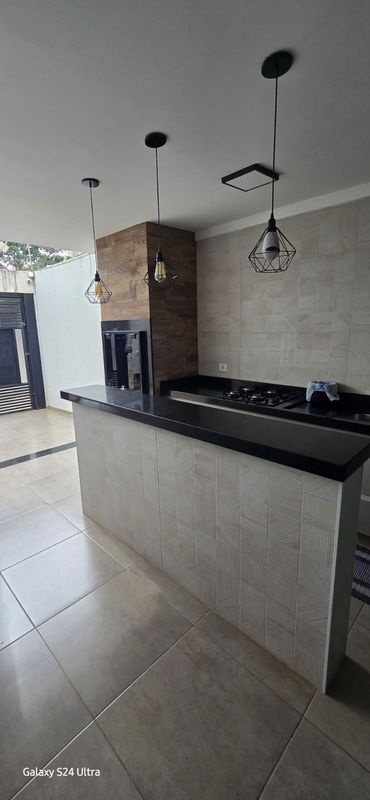 👉🏼 Área gourmet coberta ampliada e planejada com um balcão de mármore e armários